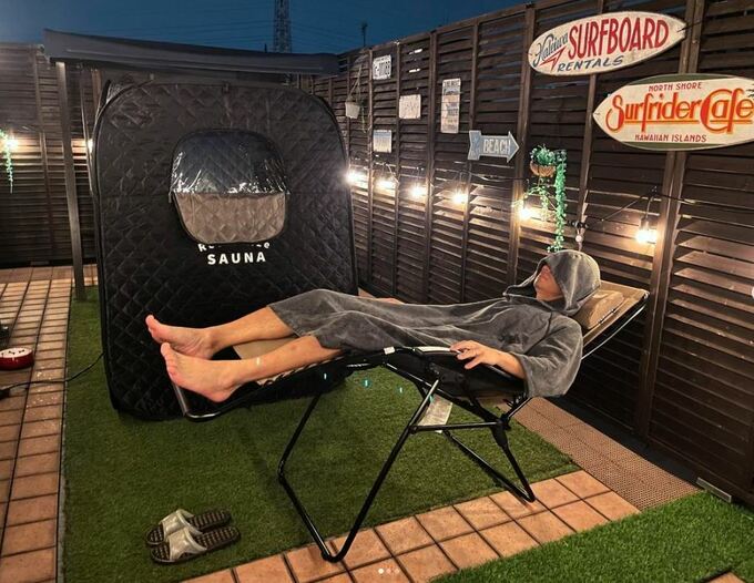 和田さんは「自宅テントサウナ。設営10分。」と簡潔な言葉で説明。和田さんのインスタグラムに頻繁に登場する自宅の屋上スペースには「SAUNA」と文字が入った黒いキルティング地のような布で囲われたテントが立っており、その手前の長椅子でガウンをかぶって和田さんがゆったり寝そべっている写真が投稿されています。