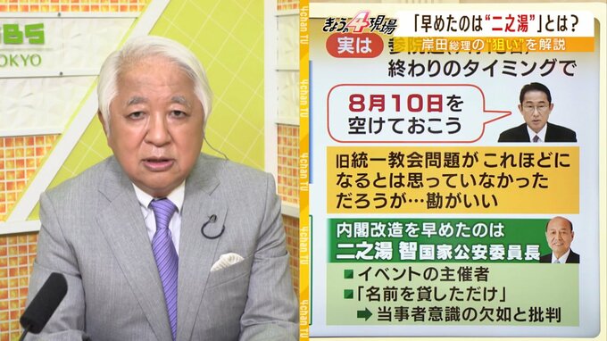 岸田さんの最側近に聞いた話ですと「そこは多分の予備日の意識だったと思うんですが、結果としてドンピシャになった」そういうふうに言っていましたね。いろんな人の話の中で引っかかるものは必ず記録してると思うんですね。その中で8月10日というのも残しておこうと。とにかく民間人閣僚というのはやっぱりここに来て非常に大きかったですね。過去に1例あるんですけども、やはりこれだけの緊急事態の中で、しかも、二之湯さん自身がですね、旧統一教会関係団体で実行委員長まで務めたということになるとですね、もうこれは持たないという判断があったんだと思います。