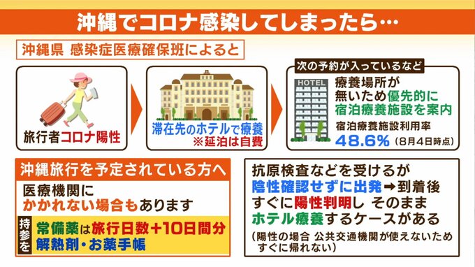 ーーー夏休みに入り、新型コロナウイルスがまだ収まっていない中でどんな旅行を楽しめばいいのか。例えば、夏に沖縄に行かれる方が多いということで、沖縄県の感染症医療確保班によりますと、「沖縄へ旅行に行って現地でコロナ陽性となった場合は、滞在先のホテルで療養してください」ということです。一方で「次の予約が入っているなどして延泊ができない場合は、療養場所が無いため優先的に宿泊療養施設を案内する」ということです。ただ、こちらの宿泊療養施設の使用率が8月4日時点で48.6%と、ひっ迫してきている状況です。沖縄旅行を予定されている方は医療機関にかかれない場合もあるので、『常備薬』は旅行日数+10日分、そのほかに解熱剤やお薬手帳などを持参してくださいということで、こういった準備も必要になってきますね?