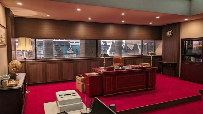 法廷の床にはドラマのテーマカラーでもある至極色を連想させる紫のカーペットが敷かれている。二見氏はこれについて「実はそれぞれの役職でセットのイメージカラーが決まっていて、弁護士は白、検察は赤、法廷は紫となっています。このカーペット1枚とっても一部屋に敷けるほどのサンプルを取り寄せました。全体のセットの統一感や、キャラクターの色彩設定も考慮しています。検事正・伊達原泰輔(野村萬斎)の部屋にもカーペットが敷かれていますが、こちらは話し合いを重ねてバリっとした強い赤に。伊達原のクセの強さを象徴する色合いになったと思います」。