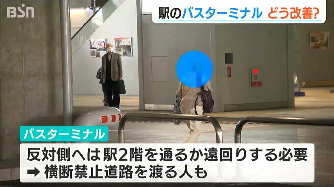 一方、バスターミナルで開業以来問題となっているのがバス道路の横断問題です。反対側に行くために駅の2階に上がるか遠回りするかしかなく、横断禁止の道路を渡る人が続出していました。