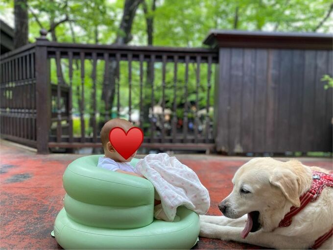 先日も郊外にアリスさんを連れて行きたくて、移動が心配でしたが、2時間30の片道でも元気にいてくれていました」と、緑の木々が見える場所で、愛娘と愛犬がのんびりする写真をアップ。