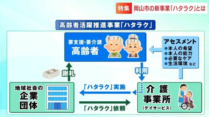 岡山市が3年前から始めた岡山市の高齢者活躍推進事業「ハタラク」は、要介護となっても、誰もが住み慣れた地域の一員として自分の役割を持って暮らしていける地域社会作りを目指しています。