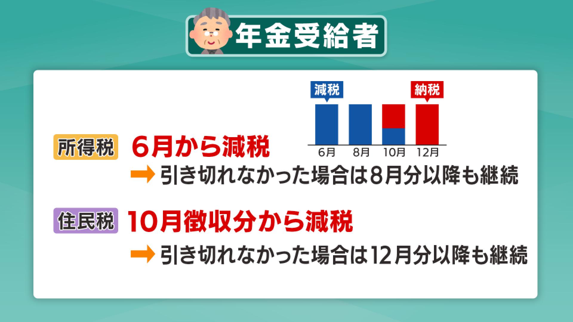 最後に年金受給者の場合です。年金は偶数月に支給されるため、「所得税」は6月で減税しきれない場合、8月以降の偶数月に繰り越されます。また「住民税」の減税が始まるのは10月からとなっています。