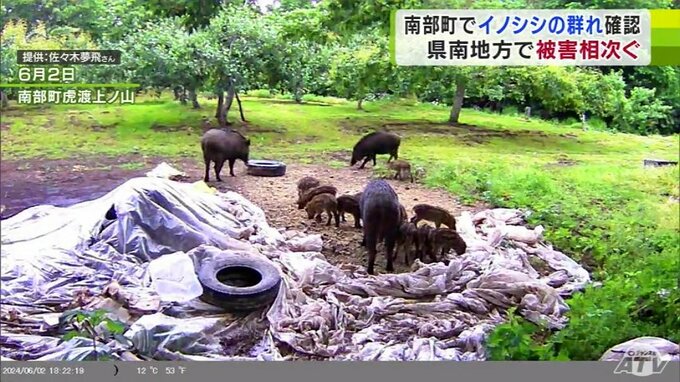 青森県南部町の果樹園で、肥料の米ぬかが荒らされる被害がありました。カメラに映っていたのは20頭ほどのイノシシの群れです。県南地方で今、イノシシの目撃や食害が相次いでいます。6月2日に撮影されたイノシシの…