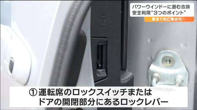 運転席にあるパワーウインドーのロックスイッチを押す。または、ドアの開閉部分についているレバーをロックにすることで、後部座席でパワーウインドーを操作することができなくなり、事故の防止に効果的です。