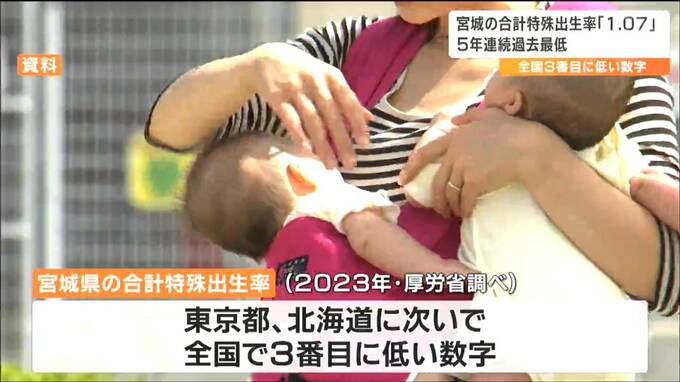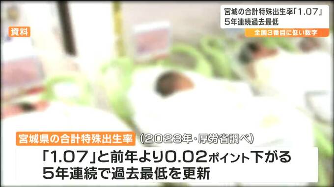 厚労省によりますと、宮城県の去年の「合計特殊出生率」は1.07と、前の年の「1.09」より0.02ポイント下がり5年連続で過去最低を更新しました。