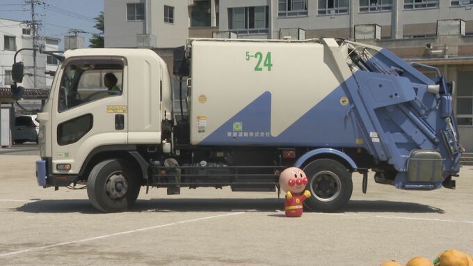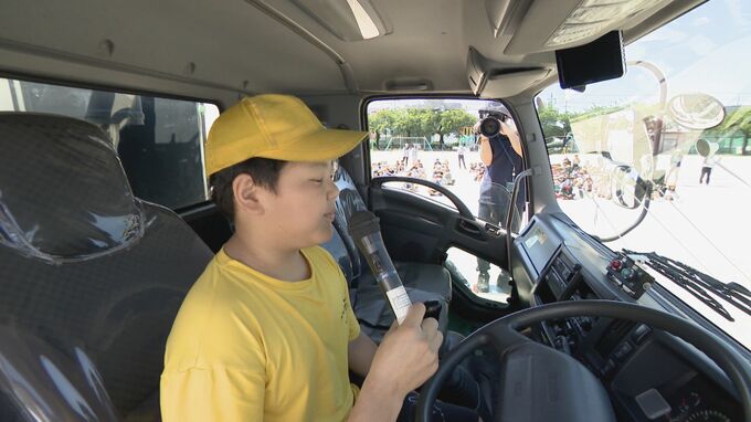 5日の安全教室では、児童がごみ収集車の運転席に座って「死角」となる範囲を確認しました。