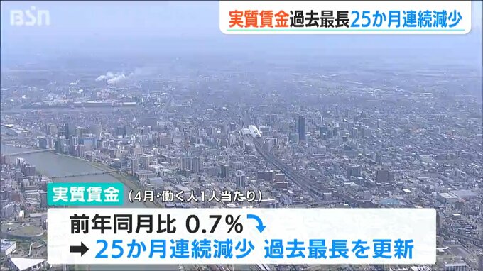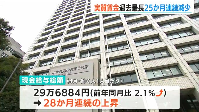 一方、物価の変動を反映した「実質賃金」は、前の年の同じ月と比べて0.7%減って、25か月連続の減少となり、過去最長を更新。賃上げもあり、実質賃金の下げ幅は改善しているものの、依然として物価の上昇に賃金が追い付いていない状況が続いています。