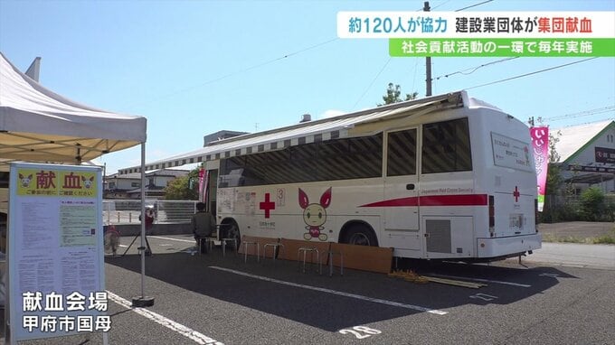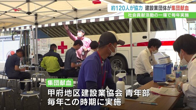献血協力者が減少する中、建設業の団体が甲府市で集団献血を行い、100人を超える人たちが献血に協力しました。
