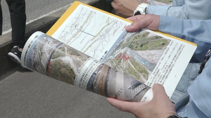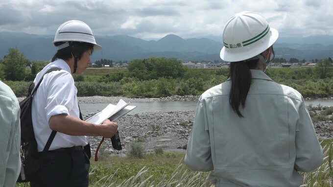 5日、立山町の常願寺川沿いで川の水位が堤防を越える恐れがある場所や、去年一時的な豪雨で護岸が削られ応急処置が必要となった場所などを確認しました。
