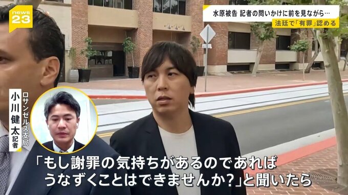 「『もし謝罪の気持ちがあるのであれば、うなずくことはできませんか?』と聞いたら、こちらに目を向けることはなかったが、前を見ながら小さくうなずいた。別の記者が『ギャンブル依存症の治療は進んでいますか?』と質問をしたところ、それに対しても小さくうなずいて、そのまま法廷の中へ入っていった」