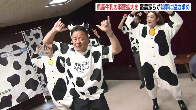 県庁を訪れたのは「広島県牛乳普及協会」のメンバーら10人です。メンバーらはオリジナルの「牛乳そんぐ」と「ダンス」を披露して、湯崎知事に消費拡大への理解と協力を求めました。