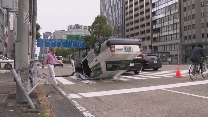 名古屋市中区でタクシーが横転し、運転手とみられる女性が軽傷です。名古屋の中心部で逆さまになった1台のタクシー。行灯(あんどん)は割れてしまっています。警察によりますと6月6日午後2時50分ごろ、中区丸の内…