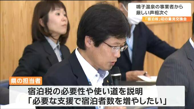 宮城県と仙台市が導入を目指す宿泊税について、県による初めての意見交換会が大崎市の鳴子温泉の旅館やホテルを対象に開かれました。出席者からは、県に対する厳しい声が相次ぎました。