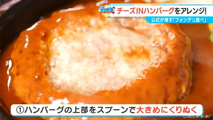 「チーズINハンバーグ」をチーズフォンデュ風にアレンジする方法を紹介します。