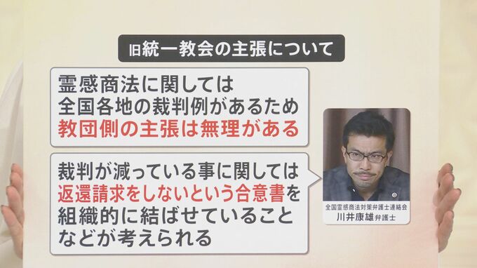これに対して、全国霊感商法対策弁護士連絡会の川井康雄弁護士は、『霊感商法に関しては、全国各地の裁判例があるため、教団側の主張は無理がある』『裁判が減っている事に関しては、返還請求をしないという合意書を組織的に結ばせていることなどが考えられる』と話していました。
