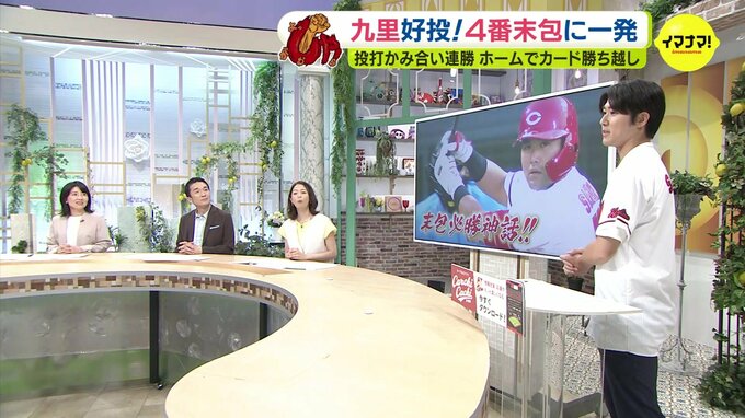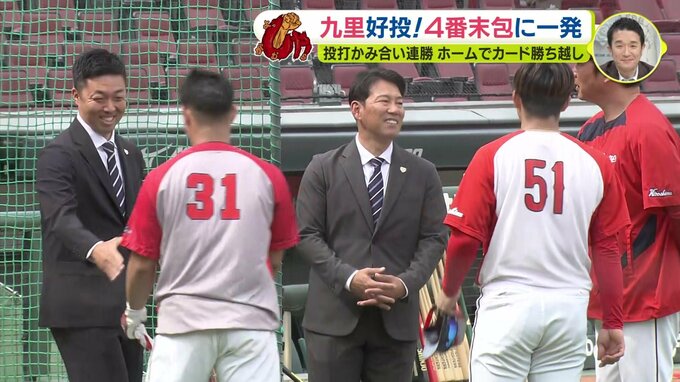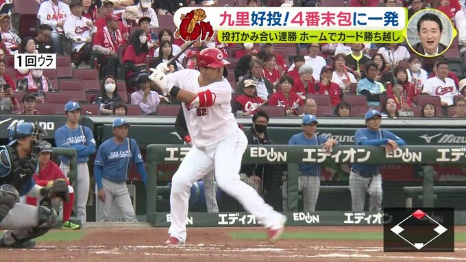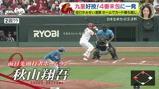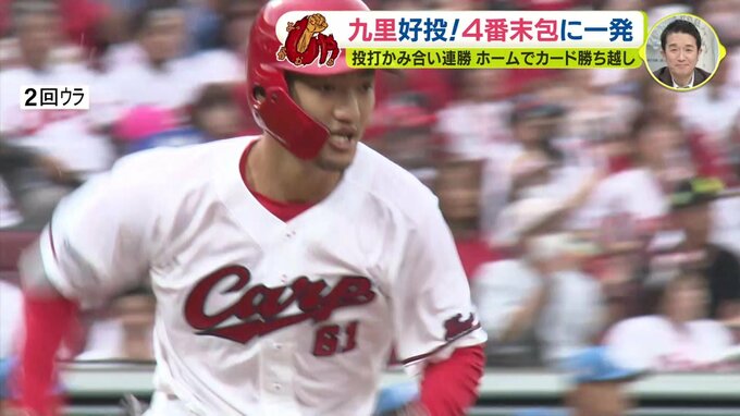 井端監督も見守る中、連勝でカード勝ち越しを狙うカープ。1回、2アウト・2塁となって、4番・末包。その初球でした。「ツーアウトだったので張り切って振っていった」としっかりとらえた打球は、看板直撃のツーランホームラン。前日の秋山の先制ホームランと同じく、これでチームに勢いがつきました。