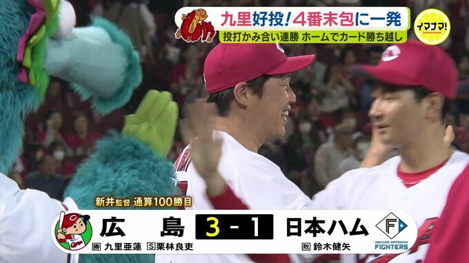 そして、2年目の 新井貴浩 監督は、節目の100勝目を達成。九里からウイニングボールを受け取りました。