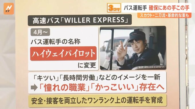 高速バス「WILLER EXPRESS」は、4月からバス運転手の名称を、“ハイウェイパイロット”に変更しました。「キツい」「長時間労働」といったイメージを一新し、「憧れの職業」「かっこいい」存在を目指すということです。安全・接客を両立したワンランク上の運転手の育成を目指していくということです。