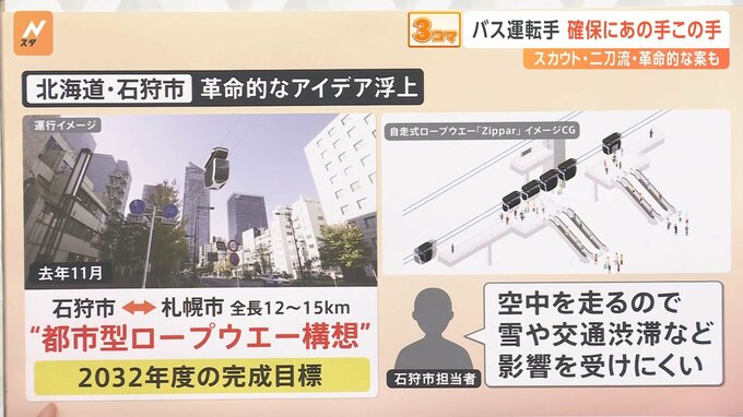 北海道の石狩市は去年11月、石狩市内と札幌市内を結ぶ全長12キロ〜15キロの“都市型ロープウエー構想”という“革命的なアイデア”を打ち出しました。2032年度の完成を目指しています。2本のロープを自走式のゴンドラが走るということです。