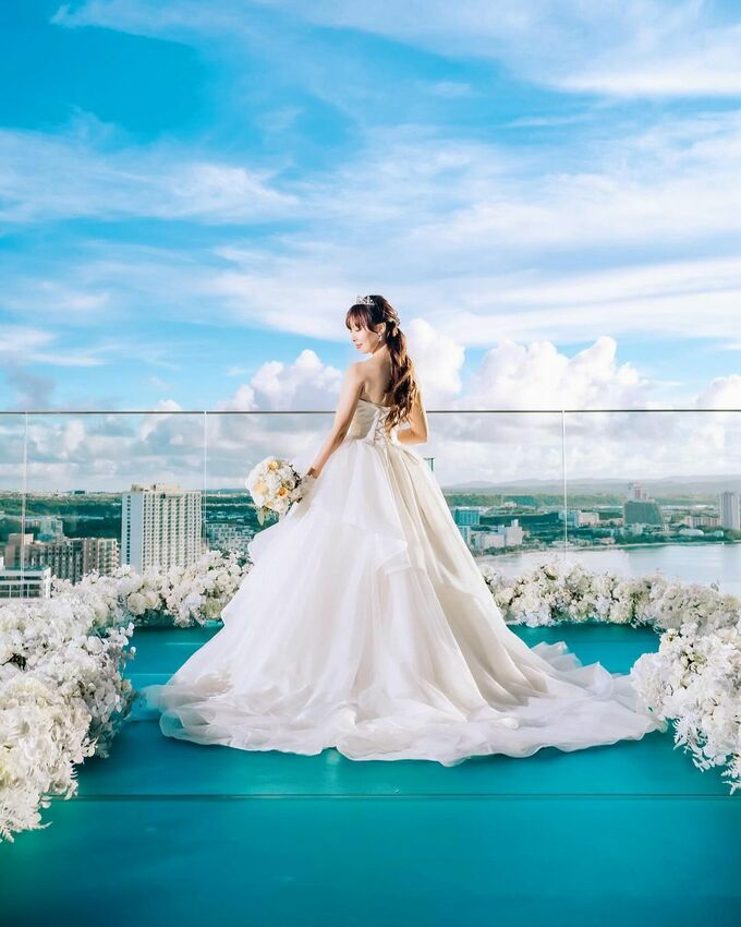 折井さんは、青空の下で純白のウエディングドレスをまとった姿の写真を投稿し、報告の文章を添えています。