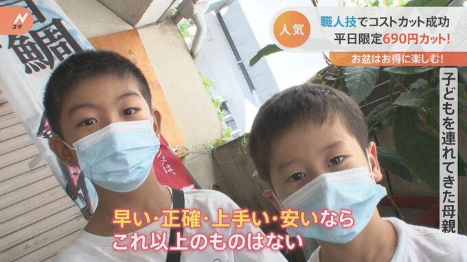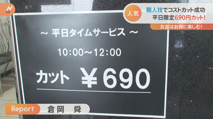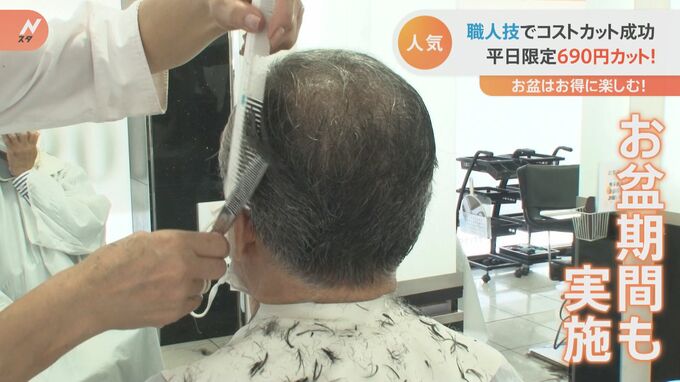 食べ物だけじゃありません。美容でもお盆に利用できるお得なサービスがあります。全国で1000店舗以上構える美容室「ヘアーサロンイワサキ」。東京・目黒区の自由が丘店で入り口のポスターを見てみると、なんと、平日限定10:00~12:00のタイムサービスでカットが690円。もちろん、お盆期間中も実施。この日も多くの人が訪れていました。その安さの秘密は“無駄を徹底的に省く”こと。