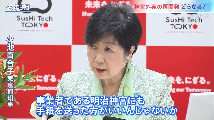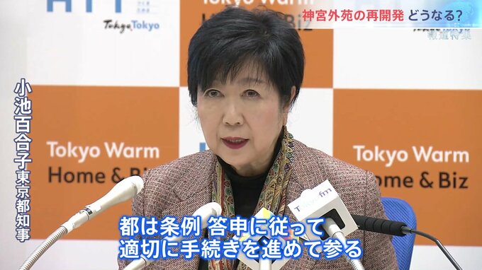 「都は条例・答申に従って適切に手続きを進めて参る。事業者においては樹木の保全にしっかり取り組む。そして内容などについて分かりやすい情報発信に努めていただきたい」