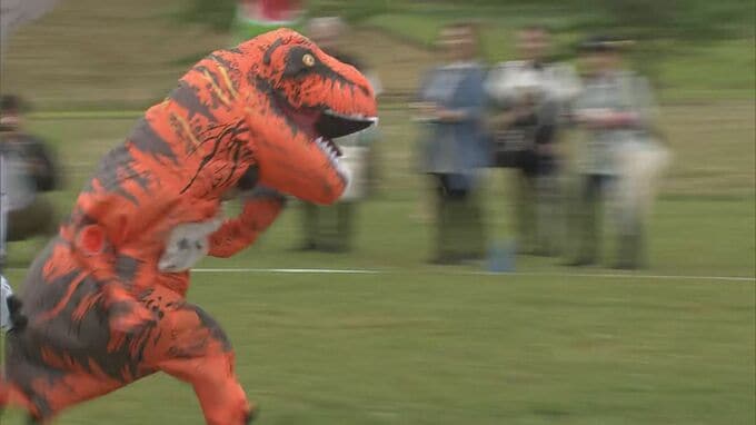 三重県津市で開かれたレース。参加者はティラノサウルスの着ぐるみ姿です。アメリカ発祥のレースで、津市を盛り上げようと地元の有志が企画しました。レースには小学生の「幼獣」と中学生以上の「成獣」の部に分か…