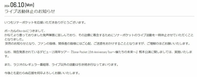 また「なお、現在発表されているデビュー15周年ツアー『Sonar Pocket 15th Anniversary Tour〜僕たちの未来〜』熊本公演に関しましては、実施いたします。」「また、ラジオのレギュラー番組等、ライブ以外の活動は引き続き行なってまいります。」と、しています。