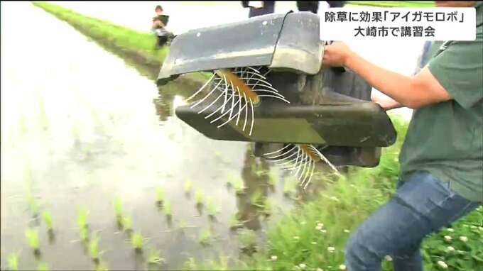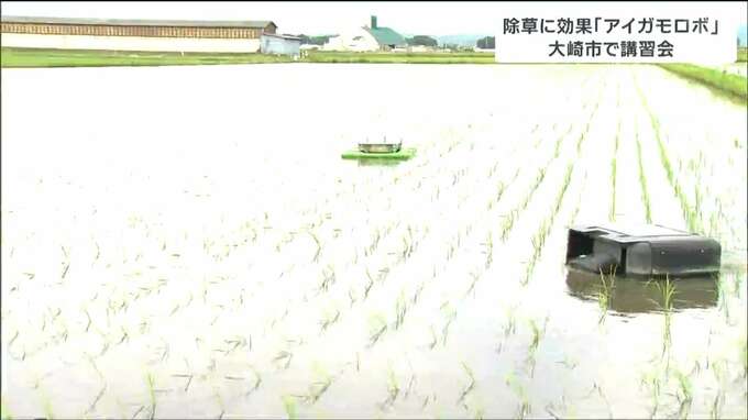 講習会には大崎市や登米市のコメ農家ら約30人が参加し、大崎市と連携協定を結んでいる東京のベンチャー企業が開発した「アイガモロボ」が公開されました。