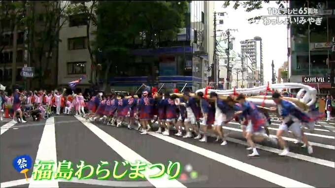 「福島わらじまつり」の演武では、長さ12メートル、重さ2トンの大わらじを男たちが担ぎ、大きく回転させると沿道から大きな拍手が沸き起こりました。