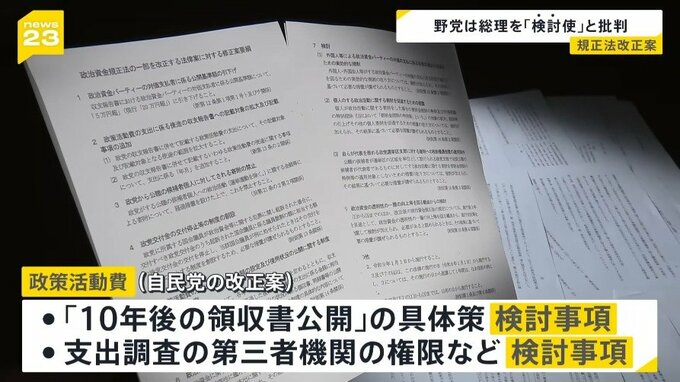 政策活動費について自民党の改正案では、「10年後の領収書公開」の具体策が検討事項で、支出を調べる第三者機関の権限なども検討事項のまま。