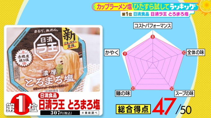 そして第1位は、日清食品の『日清ラ王 とろまろ塩』(税込307円 ※番組調べ)。