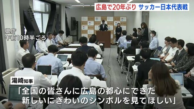 会場の「エディオンピースウイング広島」では10日、サッカー日本代表の練習が公開されました。代表戦が広島で行われるのは20年ぶりです。湯崎知事は今回のシリアとの代表戦を通じて、「全国のみなさんに広島の都心にできた新しいにぎわいのシンボルを見てほしい」と語りました。