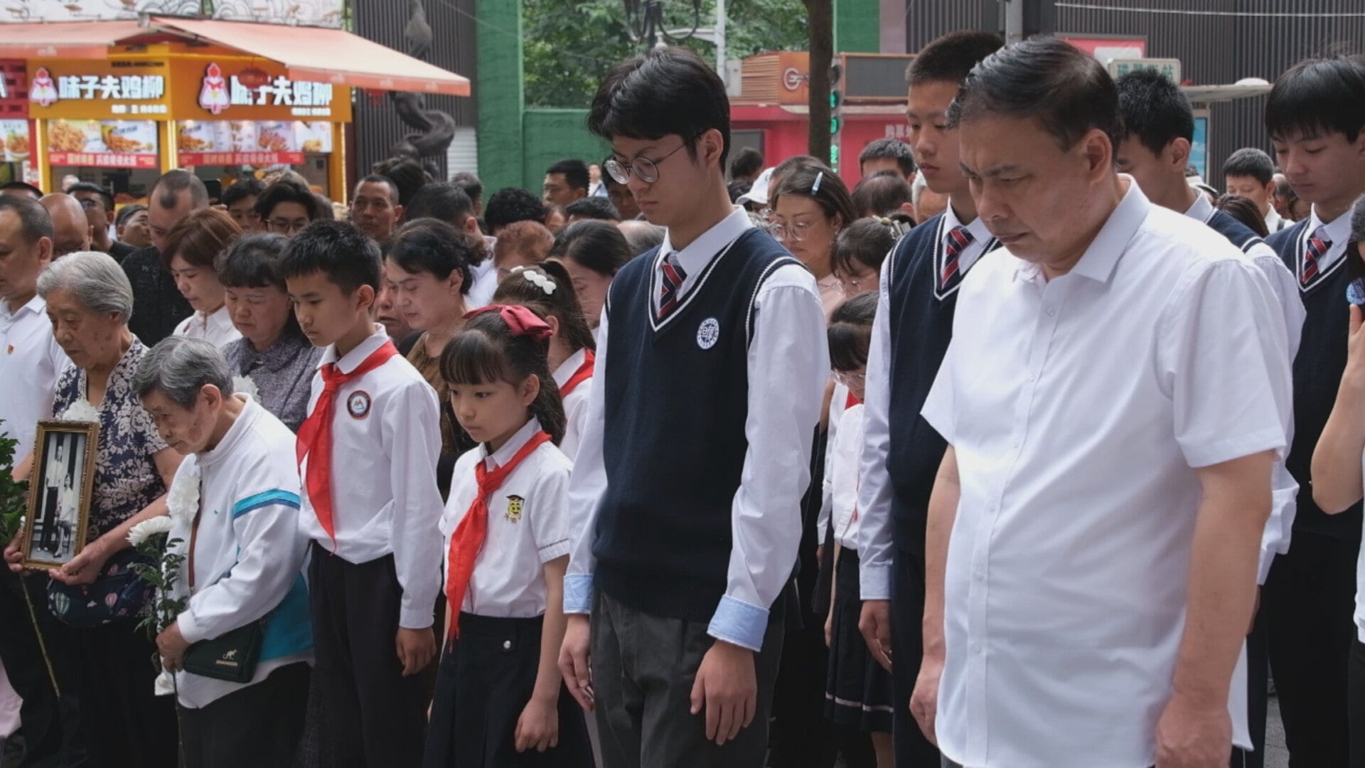 重慶の空に、12分にわたり警報が鳴り響いた。市内にある重慶爆撃を記念する碑の前には多くの市民が集まり、黙とうをささげた。