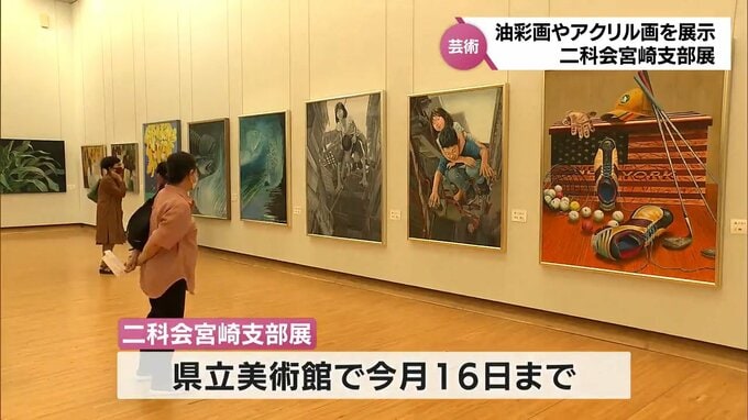 日本を代表する美術家の団体、二科会の宮崎支部の会員の作品を集めた展示会が宮崎市で12日から始まりました。この展示会は二科会宮崎支部が開いているもので、会場の県立美術館には、会員20人が描いた油彩画とアク…