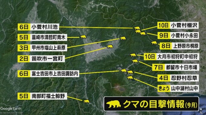 県によりますと寄せられた情報は笛吹市や富士吉田市などで少なくとも13件で、去年の同じ時期の2倍近くに増えています。