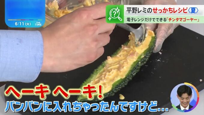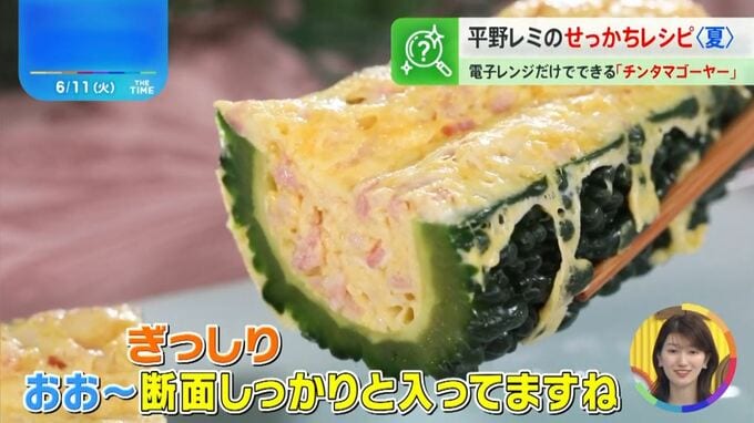 気を取り直して、出来上がりを食べた古田アナは「甘い!チーズを使っているからお子さんでも食べやすい。ゴーヤーの旨みとベーコンの味がマッチしておいしい!」と感激。