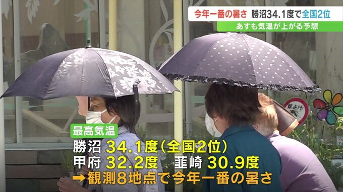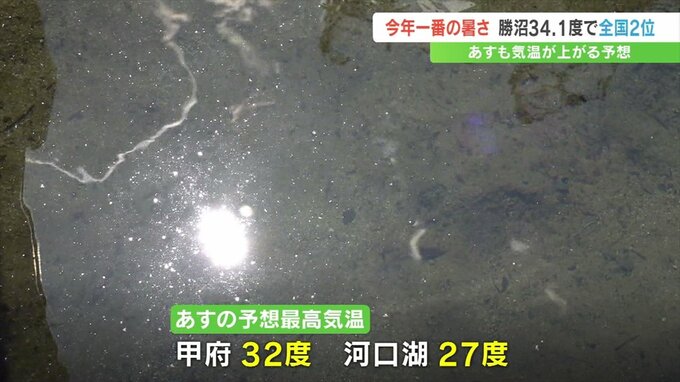 甲府地方気象台によりますと各地の最高気温は勝沼で34.1度と全国2位の暑さとなった他、甲府で32.2度、韮崎で30.9度と10の観測地点のうち8地点で今年一番の暑さとなりました。