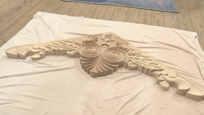 「懸魚」は福井県の彫刻家、鈴木良一さん・美央さん夫妻が手がけたもので、今年3月から過去の写真などをもとにして檜を彫りすすめ、識者の監修を受けながら約3か月かけて仕上げました。
