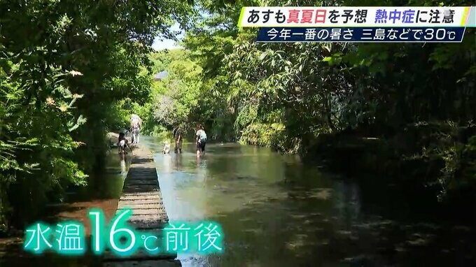 三島市を流れる源兵衛川です。富士山の伏流水を水源とする源兵衛川の水温は、年間を通して16℃前後で、訪れた親子連れは水遊びをするなどして暑さを和らげていました。