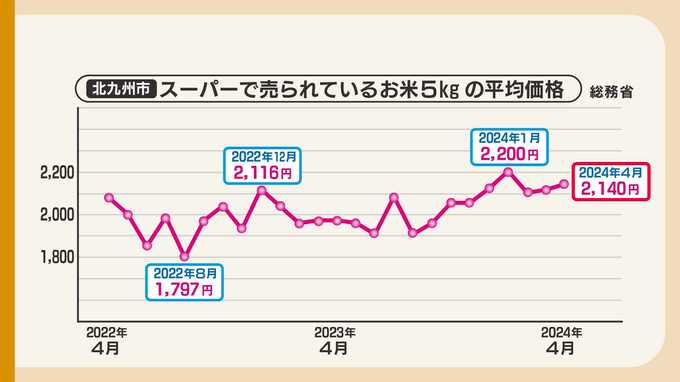 福岡県北九州市のスーパーで販売される米5キロの平均価格をみると、おととし8月は1797円でしたが、今年4月は2140円。約2割、343円値上がりしています。