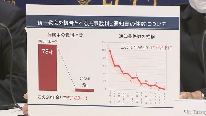 「こちらの図をご覧ください。裁判においては、1998年に係争中の案件が78件ありましたが、2022年の訴訟係属中の件数は、5件です。また、通知書件数はこの10年で10分の1に減りました。もちろん、各事案には丁寧に対応させていただいております。各報道機関は、全国霊感商法対策弁護士連絡会が発表する被害とする数字が、正しいか否か。ぜひ検証していただきたいと願っております。それが、社会的責任を持つ報道機関の責務ではないでしょうか?」