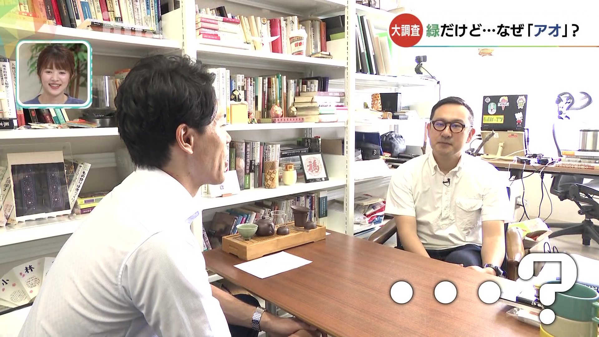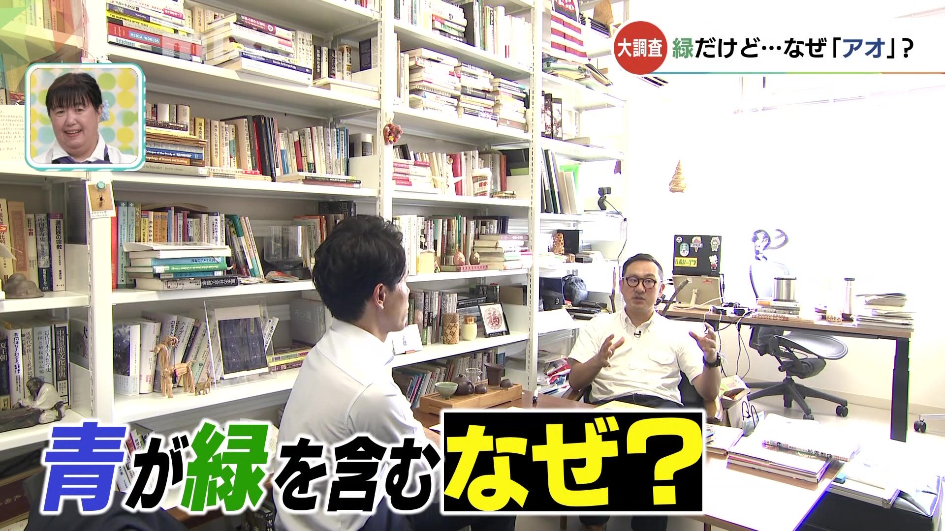 「端的に言ってしまえば、青という日本語の表現の中に、ブルーとグリーンが含まれるからです。日本語の色彩感覚として、青っていうものの含む範囲が広いっていうことですね」