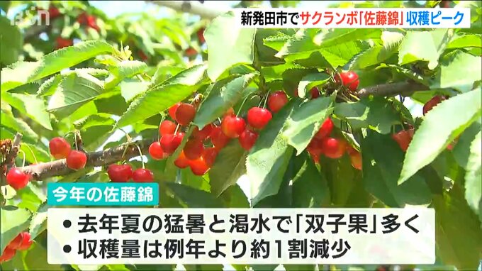 新発田市のアサカ農園でも『佐藤錦』の収穫を行っていますが、昨夏の猛暑と渇水の影響で、2つの実が繋がる「双子果(ふたごか)」がいつもより多いそうです。