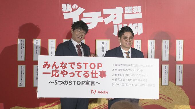 お笑いコンビのミキ(昴生・亜生)がアドビ「私のイチオー業務川柳」入選作品発表会に登壇しました。6月15日の「PDFの日」に先駆けてデスクワーカーの皆さんが、請求書をPDFで送付した後に「一応紙でも送っておくか…」など、『やらなくていいかもしれないのに一応やっている業務』を、「私のイチオー業務川柳」 にしてSNS上で応募作品を発表しました。