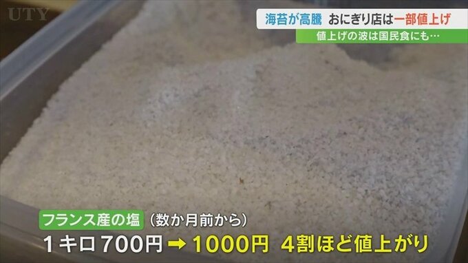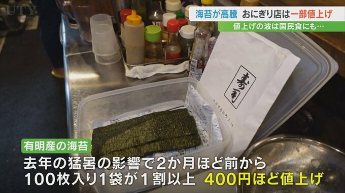 一度に数千枚仕入れるという海苔が2023年の猛暑の影響で不作となり、2か月ほど前から有明産の仕入れ値が100枚入りの1袋で1割以上、約400円値上がりしました。