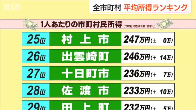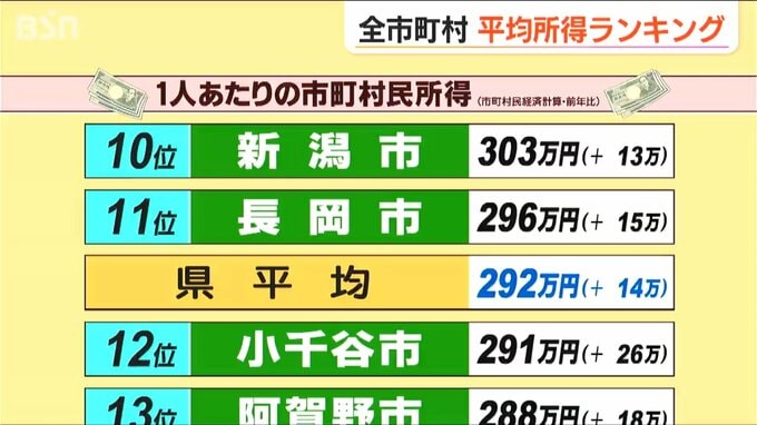 柏崎市や三条市といった人口10万人規模の市が続き、11位から上が、新潟県平均の292万円を上回る市町村となります。