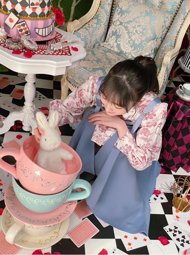 ポニーテールの小島さんがティーカップの置物に白うさぎの人形を入れている写真などを公開しました。